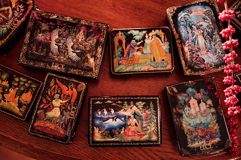 В конце вечера гостей пригласили в зеркальный зал усадьбы, где каждый гость смог выбрать шкатулку Палех с уникальным неповторимым рисунком ручной работы. Внутри шкатулки – конфеты ручной работы от шефа вечера Евгения Викентьева сделанные специально для этого ужина, вторящие главной идее проекта – культурного микса Италии и России.