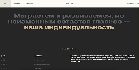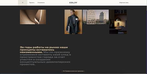 Обновленная айдентика COLDY раскрывает идею авторского девелопмента — подхода, где индивидуальность является основой каждого решения. Выразительная типографика передает архитектурную строгость и уверенный язык бренда, модульность графической системы подчёркивает адаптивность и свободу. Минимализм в оформлении транслирует честность и уважение к сути бренда, избегая лишнего декора. Авторские акценты — композиционные смещения и точечные графические элементы — усиливают ощущение уникальности и подчёркивают характер бренда. Гибкость визуального языка обеспечивает гармоничную адаптацию к разным носителям и условиям, сохраняя целостность и узнаваемость. Цветовая палитра построена на естественных, спокойных оттенках. Базовый чёрный отражает архитектурность и строгость. Серые и теплые бежевые оттенки добавляют глубину и комфорт восприятия. Имплементация золота делает стиль теплее и человечнее.