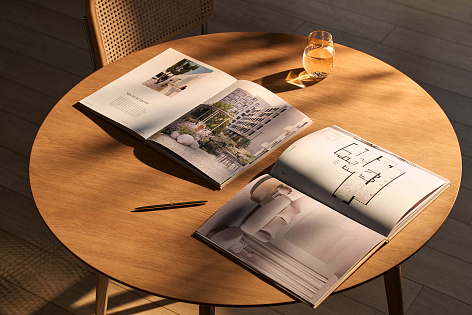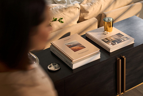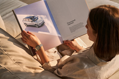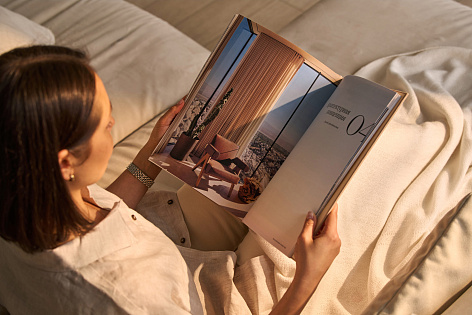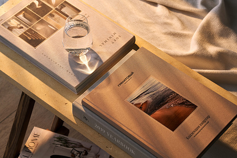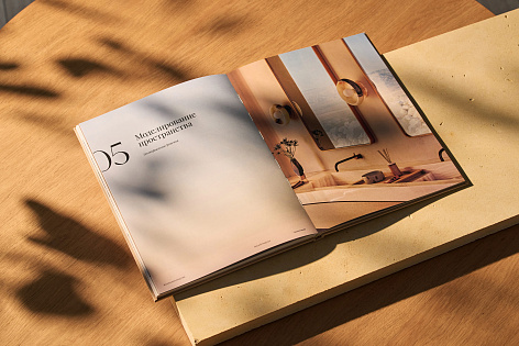В качестве формата была выбрана эстетика интерьерных альбомов: каждая деталь буклета поддерживает атмосферу отдыха и безмятежности. Тёплая цветовая гамма обложек и иллюстраций перекликается с песочными цветами архитектуры: традиционно дома в Дербенте облицовывают местным камнем — ракушечником. Шмуцтитулы с декоративным градиентом выполнены в оттенках каспийского побережья.