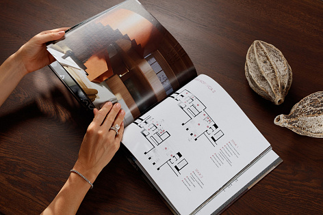 Имиджевый буклет дополняют три планировочных альбома для каждого корпуса, выполненные в фирменных пастельных тонах, перекликающихся с архитектурой самого комплекса. Эти цвета создают ощущение света, простора и внутренней тишины.