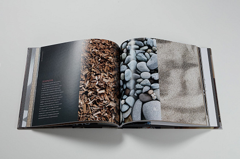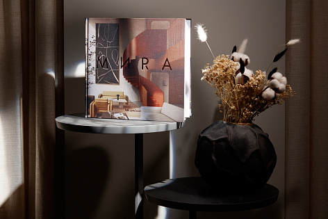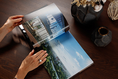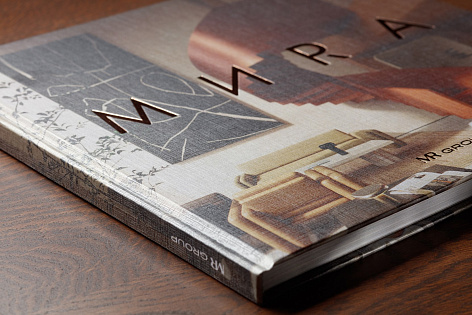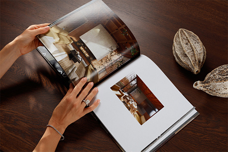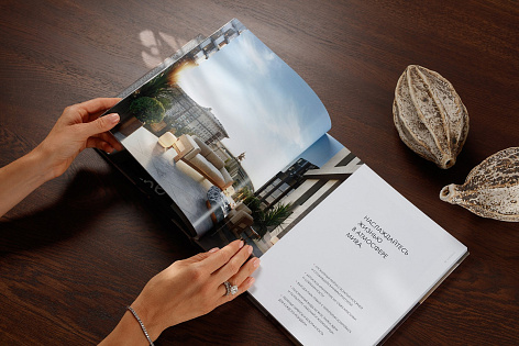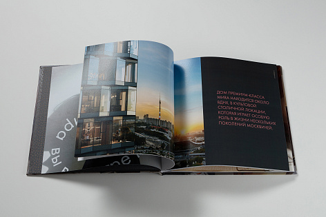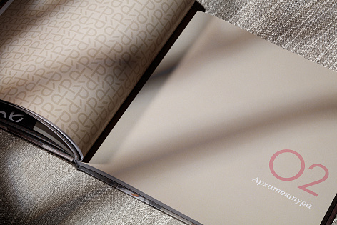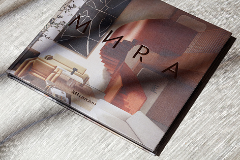 Обложка показывает «Мир внутри» будущих резидентов. Фактура обложки, выполненная с тиснением «лен» и специальной ламинацией, в сочетании с тиснением бронзовой фольгой не только создает эффект винтажности и органично отображает стиль интерьеров mid-century лобби дома, но и придает особые тактильные свойства.