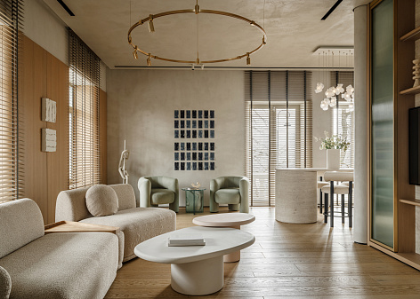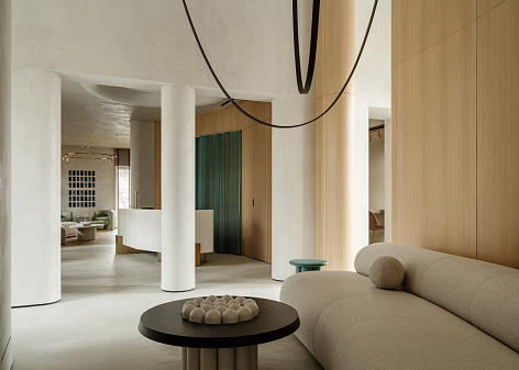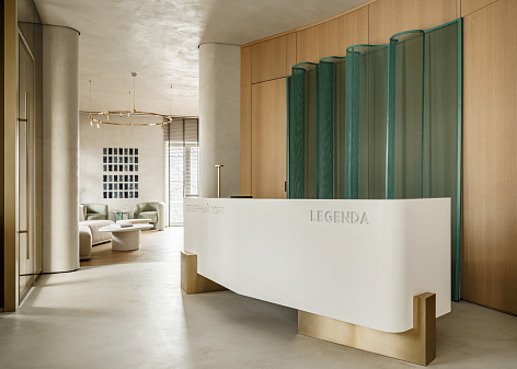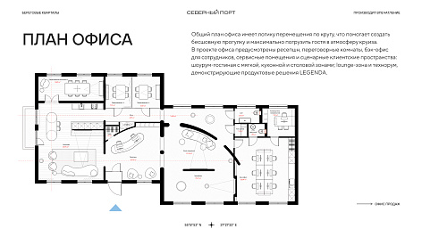 Офис реализован как шоурум продуктовых решений LEGENDA. При проектировании был реализован фирменный планировочный прием создания эстетичной среды от LEGENDA — «Театральная гостиная». Он реализован по принципу «закулисья»: большая ниша функционально и эстетично разделяет мягкую зону отдыха, столовую и зону кухни.