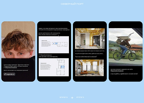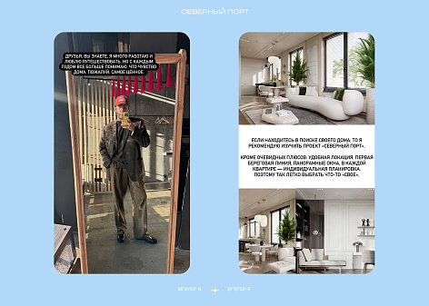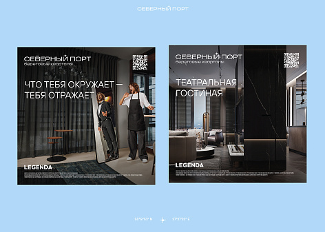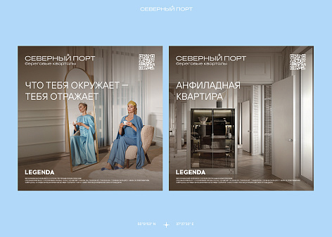 Анонсирующий CGI-ролик добавил интриги перед стартом кампании. Эстафету подхватил креатив в виде имиджевой фотосъёмки и рендера с отражением, который позволил отстроиться на фоне привычных изображений домов и продуктовых слоганов. В Indoor креатив дополнился баннерами с текстом-перевёртышем напротив зеркал. Спецпроект с инфлюенсерами “Тренировка на парусной яхте в Северном Порту”, а также PR-материалы поддержали присутствие в эфире в летний период. А завершающий флайт с серией видеороликов, отражающих яркий внутренний мир героев в авторских планировках LEGENDA, и digital-проектом, очень лично рассказывающем о “не случайной” обстановке квартиры у приглашенных блогеров, завершили последовательный рассказ о проекте.