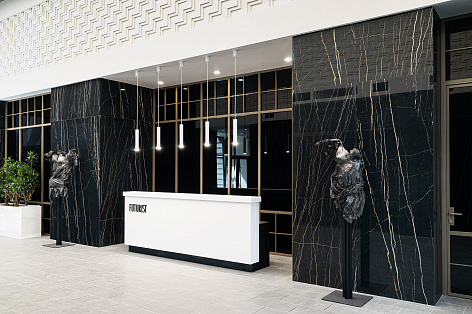 «Легенда» и художественная концепция объектов Дмитрия Жукова гармонирует с архитектурно-дизайнерскими решениями дома Futurist – фасады дома облицованы юрским мрамором (известняк, который добывается в месторождениях на территории Германии). Это удивительный материал, который сформировался 150 млн лет назад на дне древнего моря и до сих пор хранит в себе окаменелости раковин древних моллюсков.